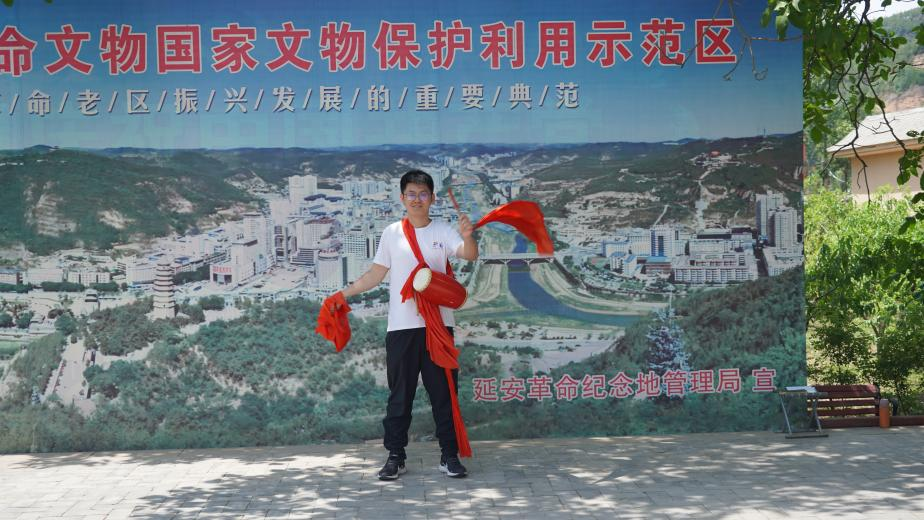 7月26日下午,实践团抵达王家坪革命旧址。1937年至1947年,这里作为中共中央革命军事委员会和八路军总部的所在地,是中国共产党的军事指挥中心。实践团进入中共中央军委礼堂,“庆祝抗日胜利中华民族解放万岁”看到条幅上的话语,实践团学习到,军委和总部曾在此庆祝抗日战争的伟大胜利。接着实践团来到延安华侨救国联合会旧址,延安侨联团结当时留在延安的华侨,联络海外侨胞,为中国的抗日战争和民族解放做出了重大贡献。随后,实践团步入毛泽东旧居,看到床头放满的书籍,书角磨损,书页皱褶,脑海中浮现出毛主席在无数个夜晚挑灯夜读的情形,感慨于毛主席为中国革命付出的巨大努力。顺路而行,实践团被桃林公园内的安塞腰鼓表演所吸引。他们头戴白毛巾,用力地挥舞着鼓槌,红色的鼓绸随着表演在空中飞扬。每一个舞姿都让实践团颤栗在浓烈的艺术享受中,令人叹为观止。实践团成员表演者的口中了解到,安塞腰鼓是延安市安塞区的传统舞蹈,也是国家级非物质文化遗产。随后实践团成员向表演者学习了安塞腰鼓表演的一些动作。