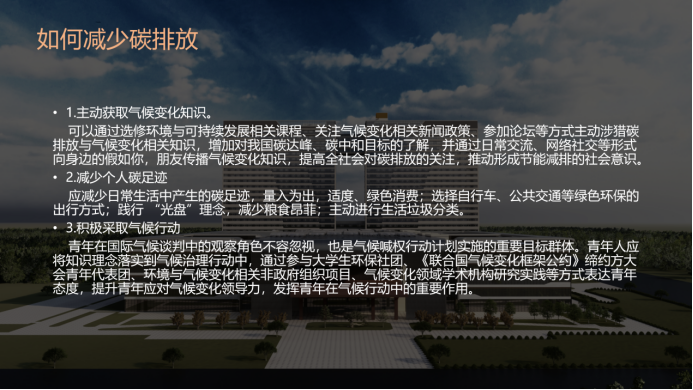 实践团首先引出宣讲的目的与背景。当今温室气体的过量排放导致温室效应不断增强,对全球气候产生不良影响。为减弱这种影响,达到双碳的目标,离不开每一位公民的努力。实践团为向公众普及双碳理论知识,特地开启直播。
