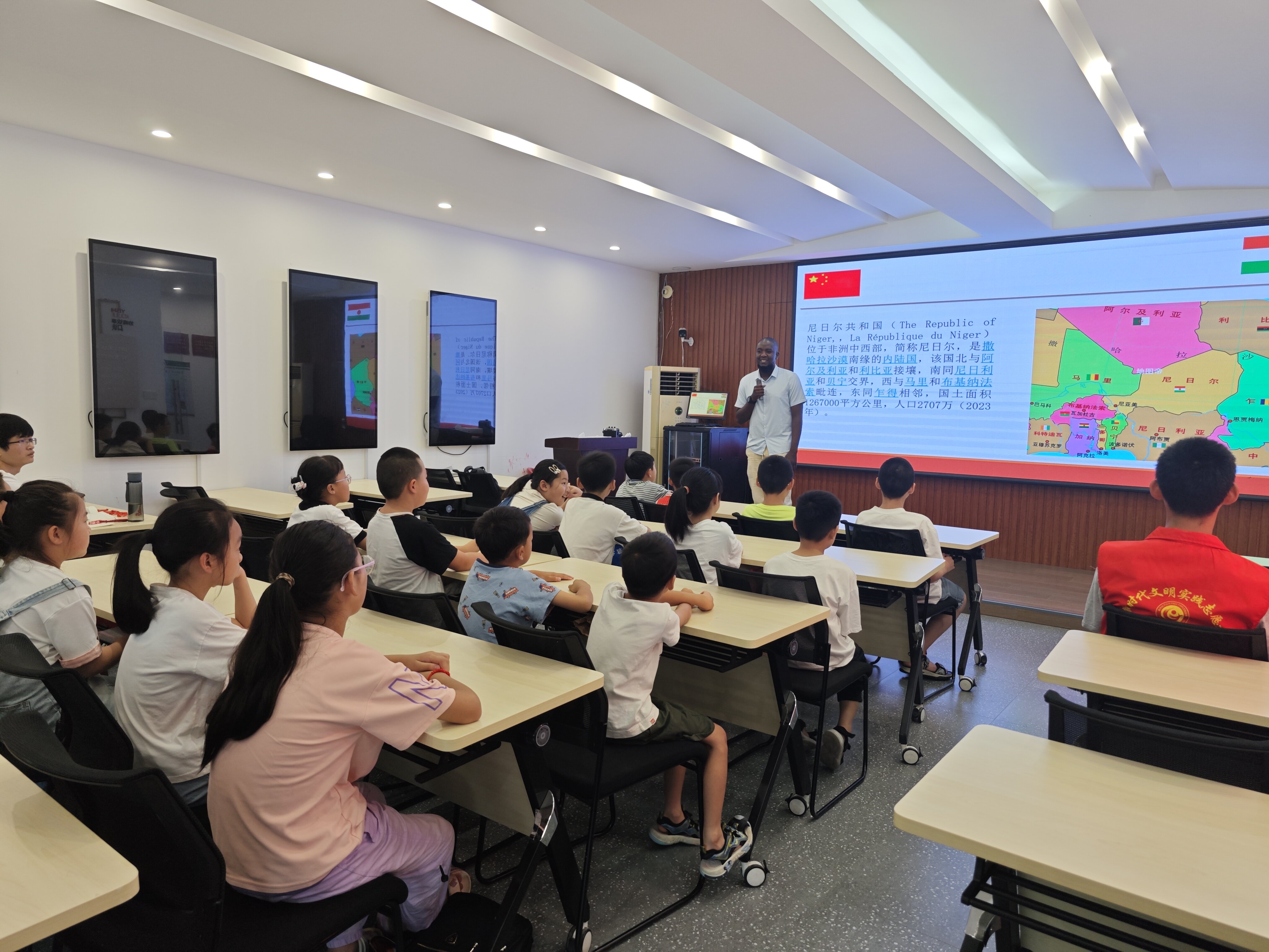 曼多同学关于尼日尔文化的授课拉开这一天的序幕。在课堂中,他运用自己熟练的中文,着眼于尼日尔地理、人口、民族、服饰、节日、食物等多方面,给孩子们带来一场盛大的文化盛宴。孩子们对新奇的文化,对于从未见过的服装,从未听说过的食物名称展示出浓厚的兴趣,积极参与课堂同老师互动。在倾听与挖掘的过程中,尼日尔文化在孩子们幼小的心灵中发芽,接受并欣赏不同的文化的观念亦深入到每个孩子心中。