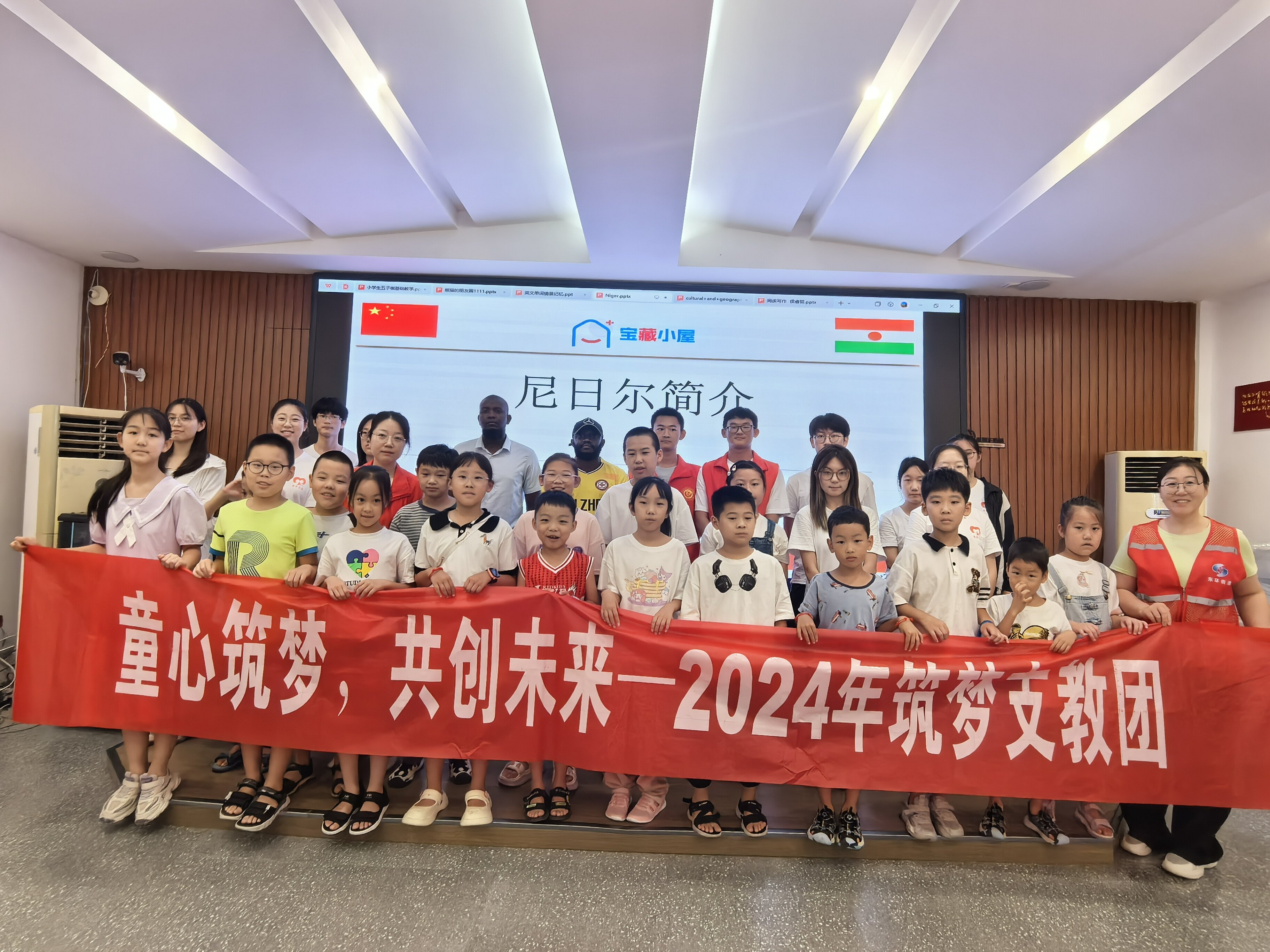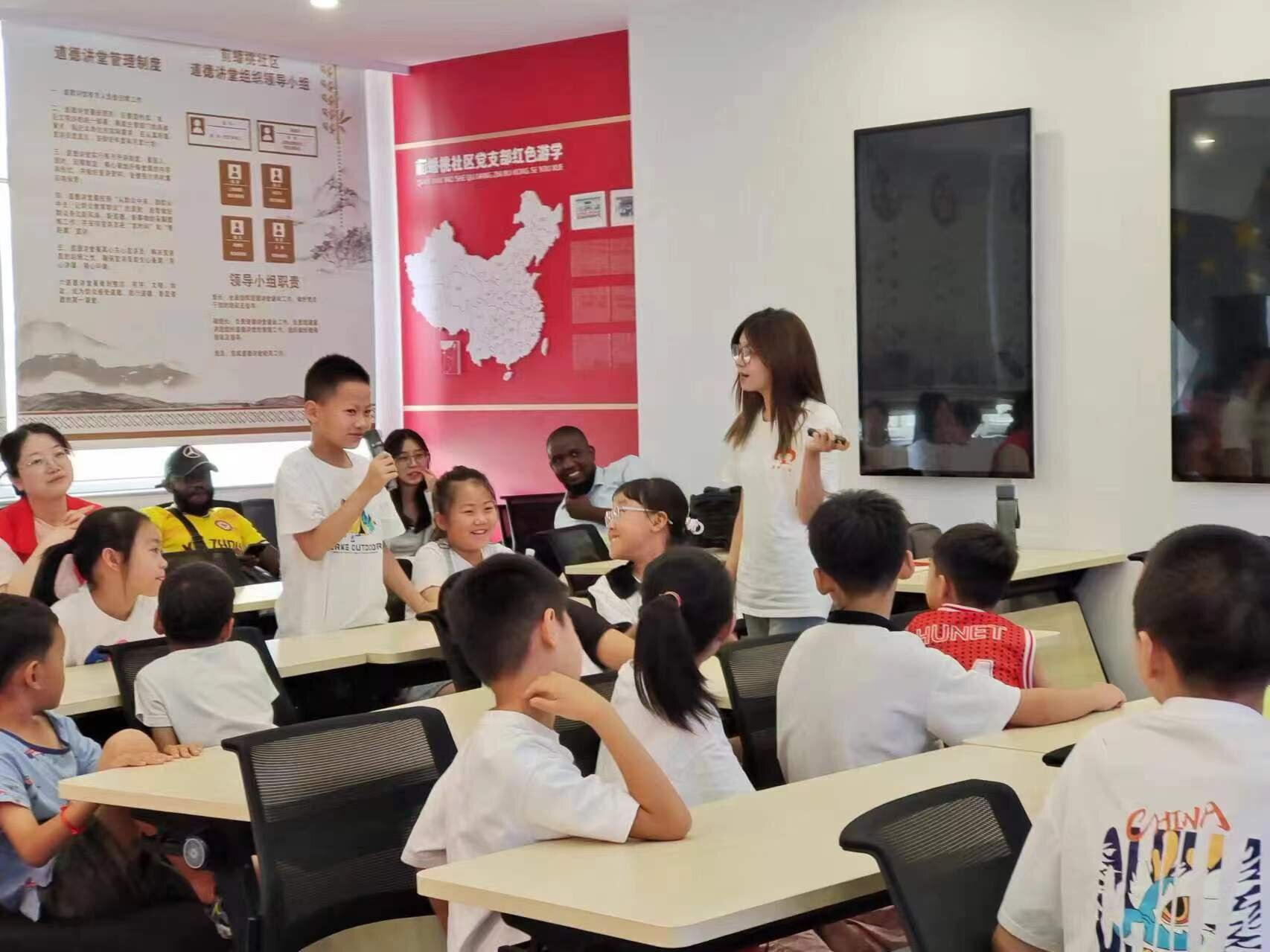 紧随其后的是奥古丝同学对于赞比亚文化与中国文化不同之处的讲授。即使语言不通使用英文授课,翻译同学也为其与孩子们搭建起一座爱的桥梁。奥古丝同学以询问孩子们是否知道撒哈拉沙漠为开场,从地理与人口的角度讲述中国与赞比亚的不同。除此之外,他还对中国与赞比亚气候进行对比,并对孩子们说赞比亚温度维持在十几至四十度之间,并不会出现下雪的情况,孩子们表现得很惊奇。深入研究赞比亚民族文化也是奥古丝的一个重点,他指出,同中国的56个民族一样,赞比亚亦有着不同的民族,这些民族相亲相爱,已然是一个共同体。最吸引孩子们的是他对赞比亚食物的介绍,孩子们提出各种天马行空的问题等待老师的回答,课堂在高涨的氛围中落下帷幕。