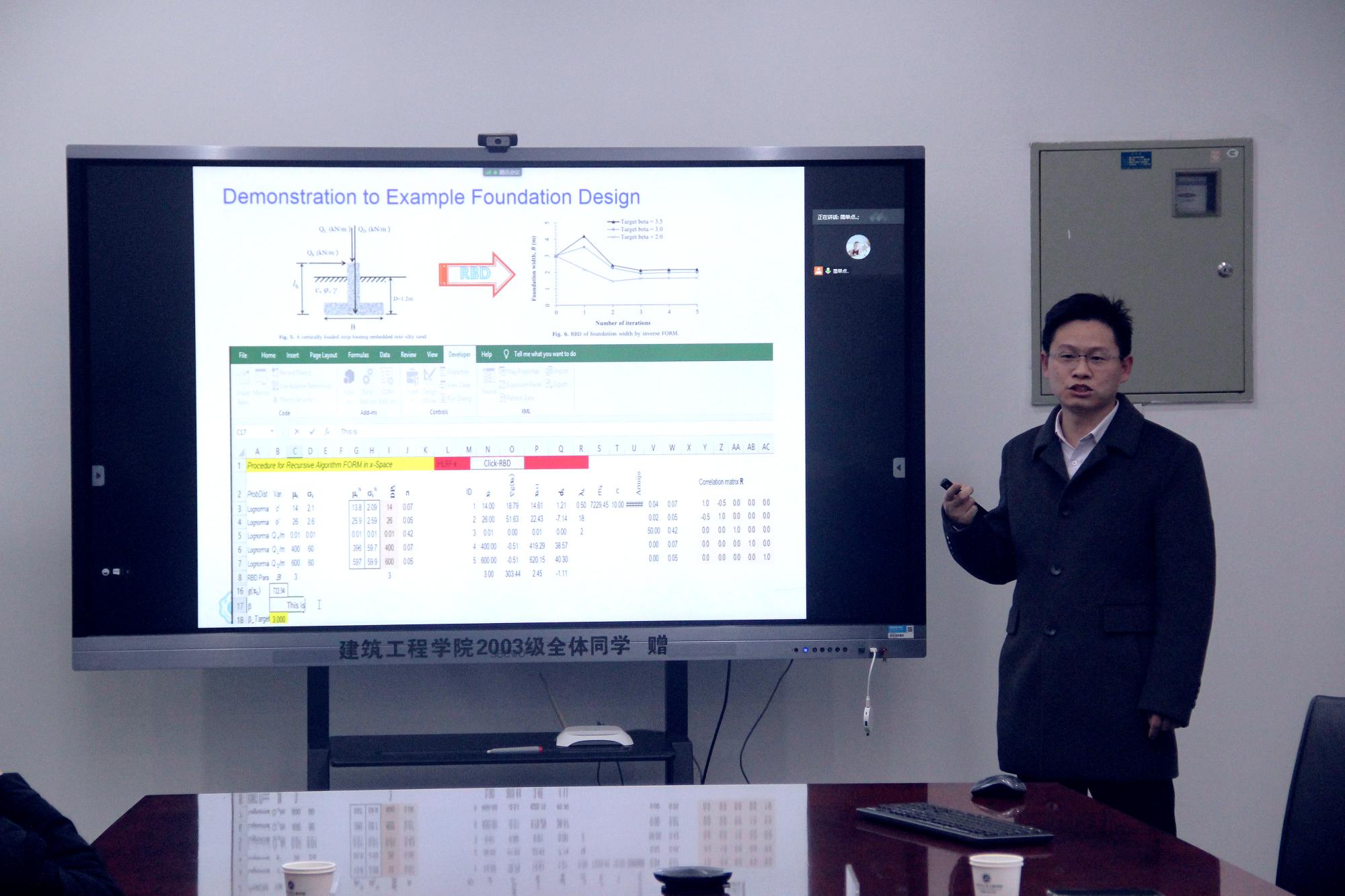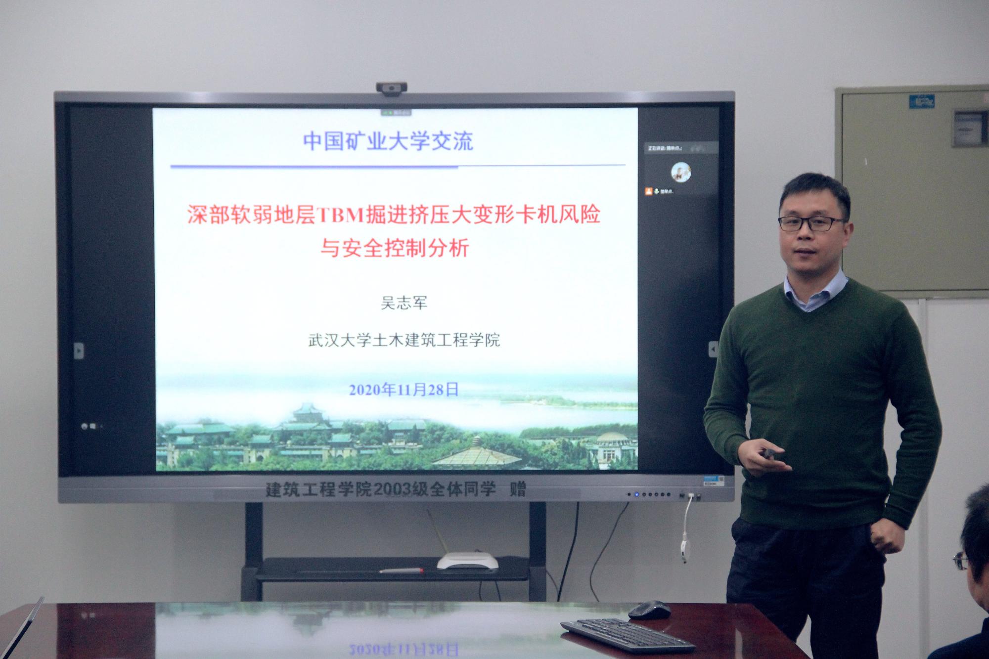 2020年11月28日下午,在yL23411永利官网登录A220举办了“土木名家讲坛(2020年第三期)”,学院邀请到武汉大学吴志军教授与河海大学姬建教授,分别作了题为《深部软弱地层TBM掘进挤压大变形卡机风险与安全控制分析》、《地震响应下的土质边坡破坏概率分析及其可靠度设计原理》的学术报告。报告会由研究生副院长杨圣奇教授主持,学院及实验室相关专业师生共70余人,以线下与线上的形式聆听了报告。